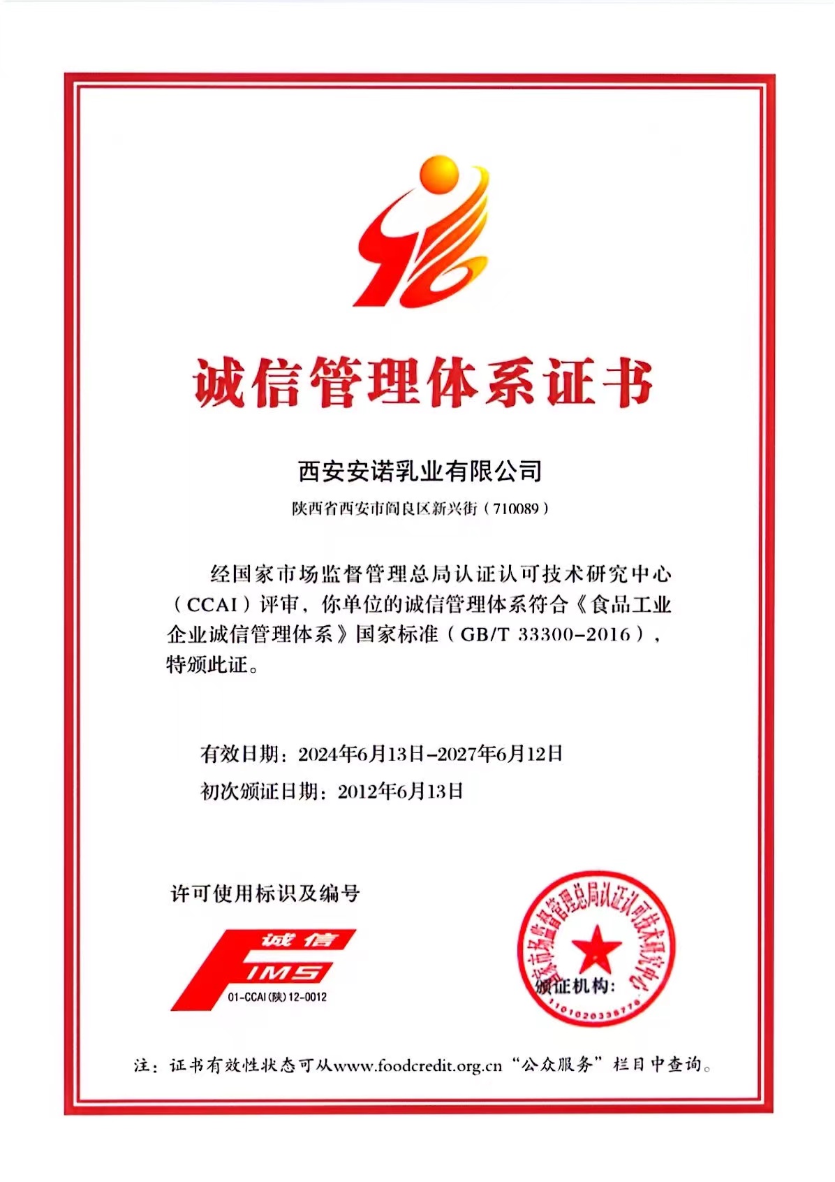 西安安諾乳業有限公司被評定為“區級放心消費示范單位”