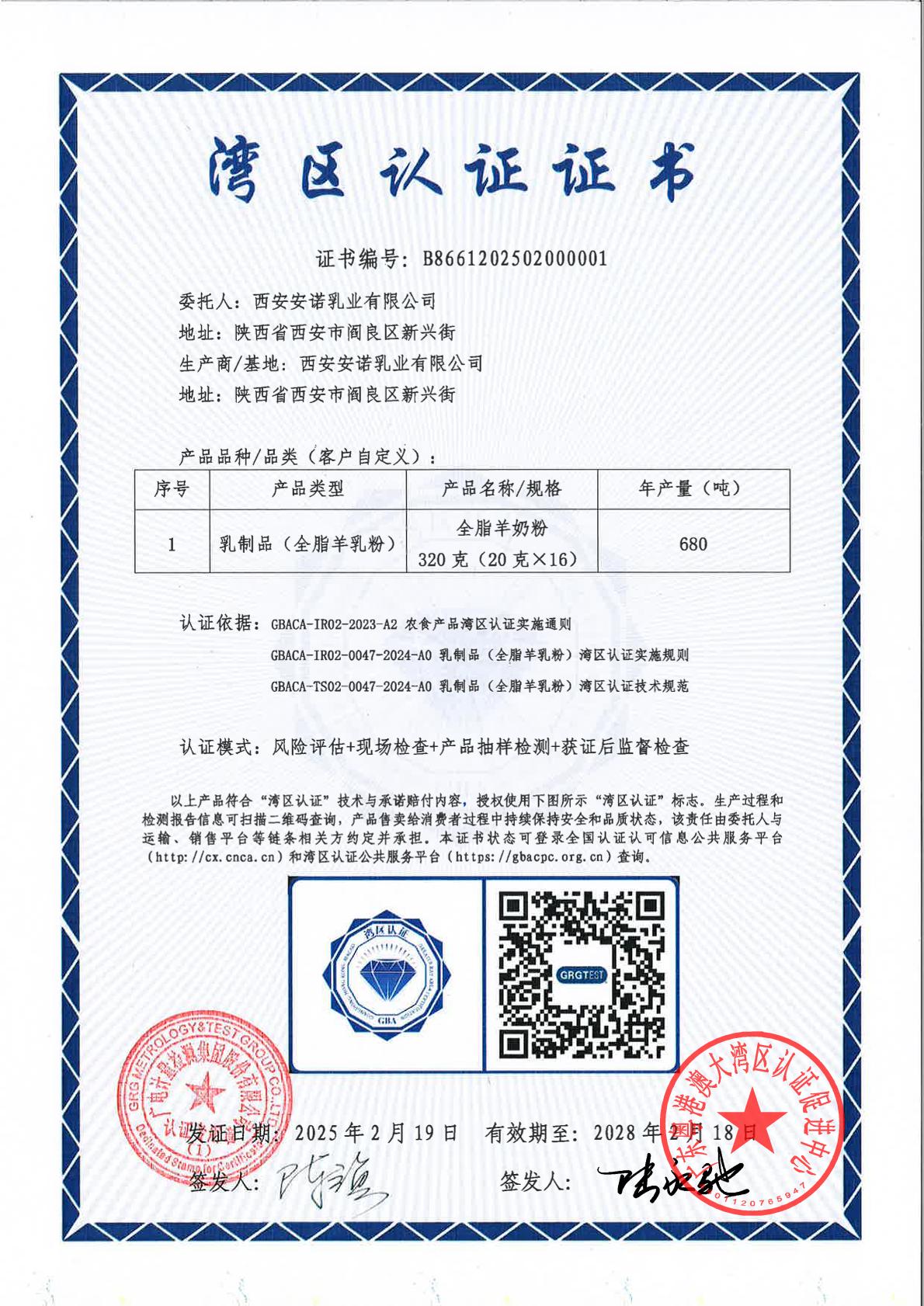 2025年2月19日,安諾乳業旗下全脂羊奶粉榮獲灣區認證證書,成為粵港澳大灣區大健康食品領域首批獲得該認證的羊乳制品企業。這不僅是安